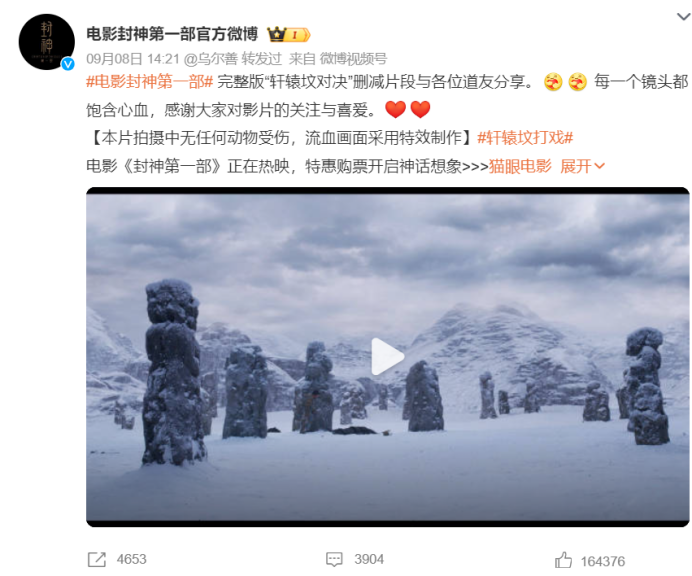 片方主动放出删减片段不算是新鲜事,暑期档的《封神》也在上映一个半月后释出了“轩辕坟对决”的完整版,但与《坚如磐石》这种拼图式营销不同,前者的删减原因可能只是基于成片时长与效果的因素,引发的讨论也集中在演员演技,而非删减本身。