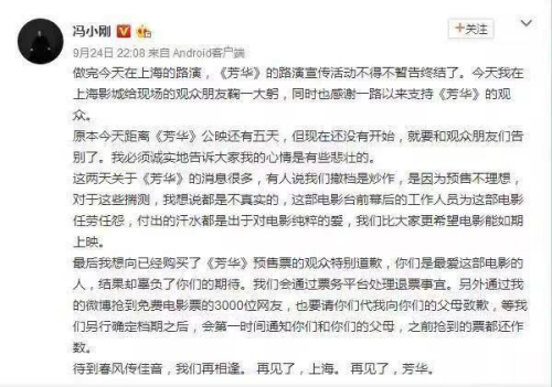 一般来说,临时撤档会面临“临阵脱逃”的质疑,对于电影是反向作用,但当时《芳华》客观上却利用这次撤档获得了巨大的舆论热度。结束了上海的路演后,导演冯小刚在次日凌晨直接发微博回应电影撤档,登上热搜,《芳华》的热度不再局限于电影领域,而成为一项社会关注的话题,这条微博在之后一两年中仍牢牢占据冯小刚个人微博的热门位置,热度可见一斑。