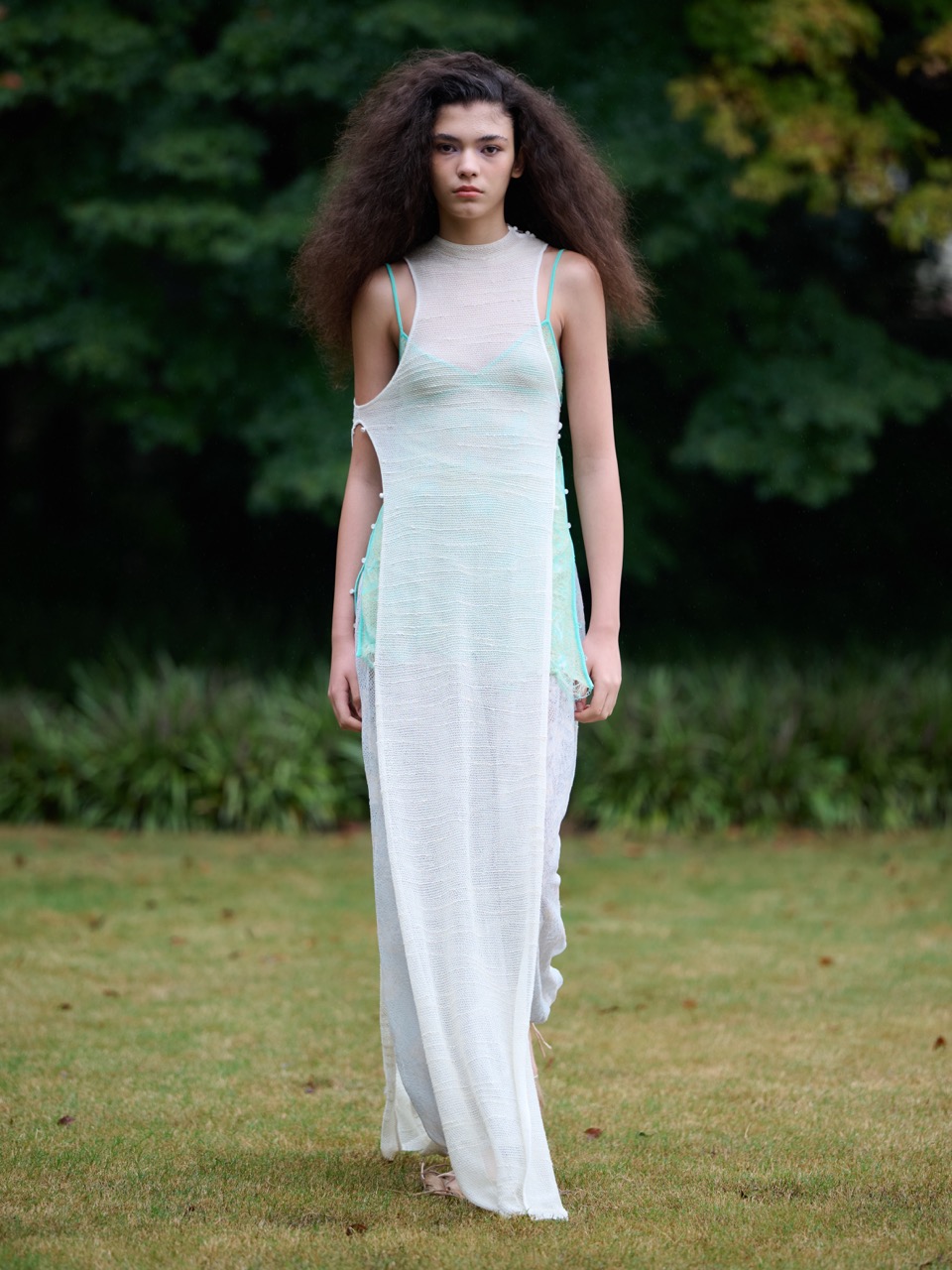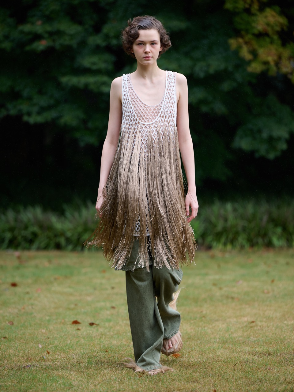 充满童话色彩的系列中,设计师巧妙运用编织结构打造出层层叠加、起伏流动的轻盈面料,仿佛是电影里随风飞扬的麦浪,令人想起女主自由翱翔的命运。移针、浮线等技法赋予面料自然的肌理变化,将野性的奔放注入服饰之中。