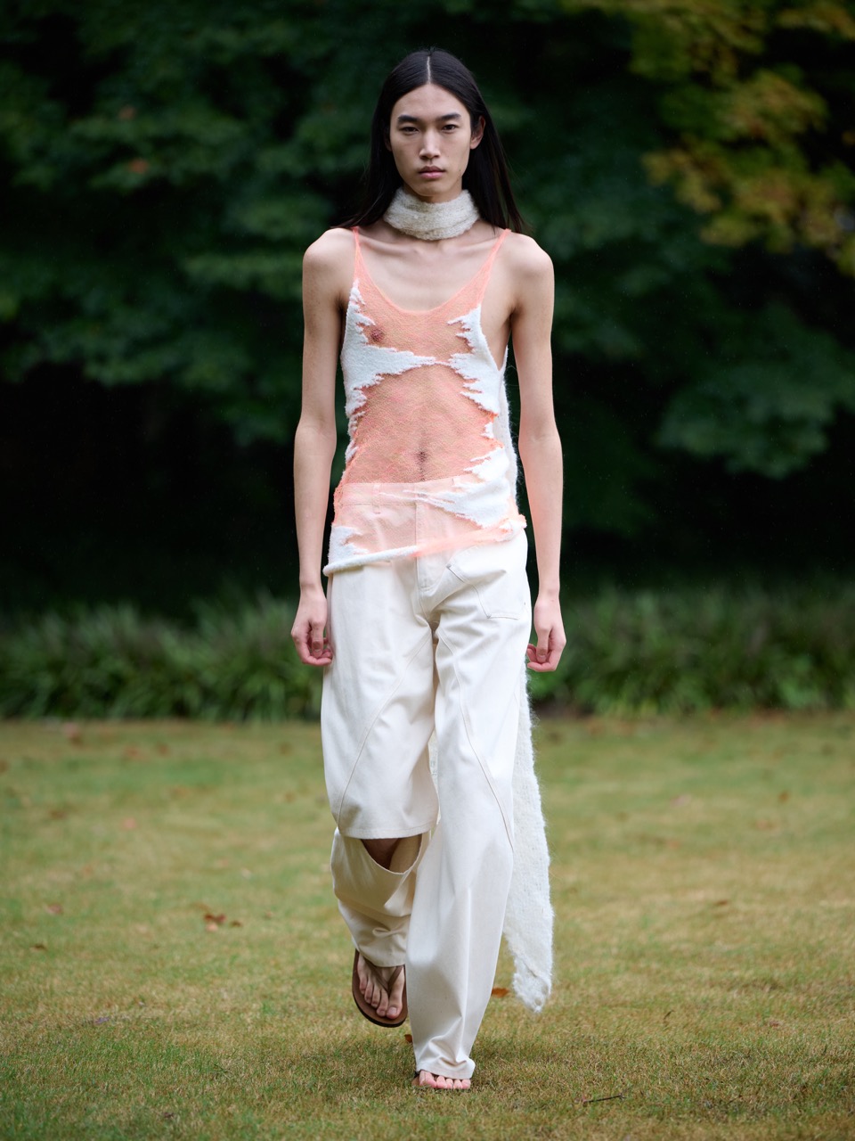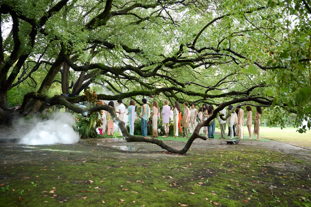 本季汲取设计师故乡潮汕的传统文化灵感,将东方禅意注入时尚设计,留白的表现手法令观者玩味想象。系列中出现了传统灯笼与旗帜元素的抽象演绎,并与艺术家合作,创作具有仪式感的压轴系列。