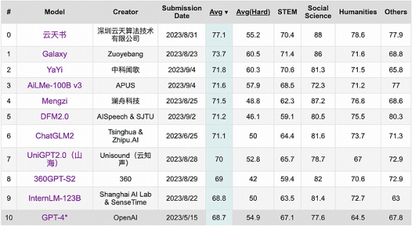 9月,学术界当红开源评测榜单C-Eval最新一期排行榜中,云天励飞的大模型“云天书”排在第一,而GPT-4仅名列第十。