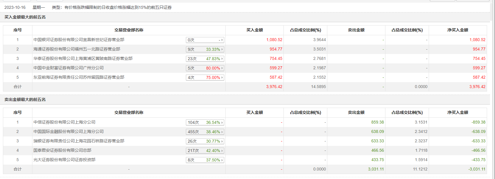 10月16日,华丰科技今日涨停,全天换手率达21.47%,振幅达21.02%。龙虎榜数据显示,营业部席位合计净买入945.31万元。其中,中国银河证券宜昌新世纪证券营业部、海通证券福州五一北路证券营业部分别买入1080.52万元、954.77万元;中信证券上海分公司、中国国际金融上海分公司分别卖出859.38万元、638.09万元。