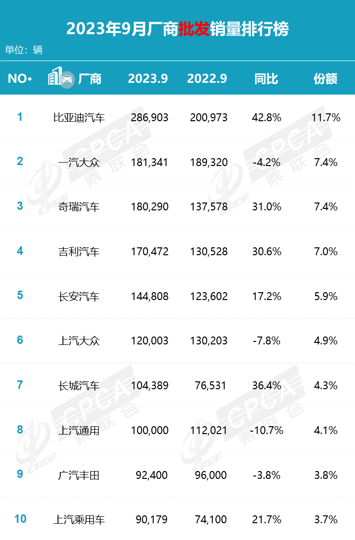 第7、8位分别是长城汽车、上汽通用,和8月排名完全一致。同时,它们9月乘用车批发量也超过10万辆。