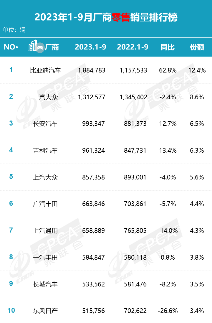 4、前9月乘用车累计零售量排名前10位的公司,和前8月时完全一致。公司还是这10家,位次都一模一样。