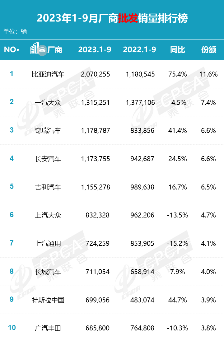 上汽通用、长城汽车相较于前8月时,各爬升一个位次,分别录得7、8位,而特斯拉中国则从前8月乘用车批发量的第7,降至第9。