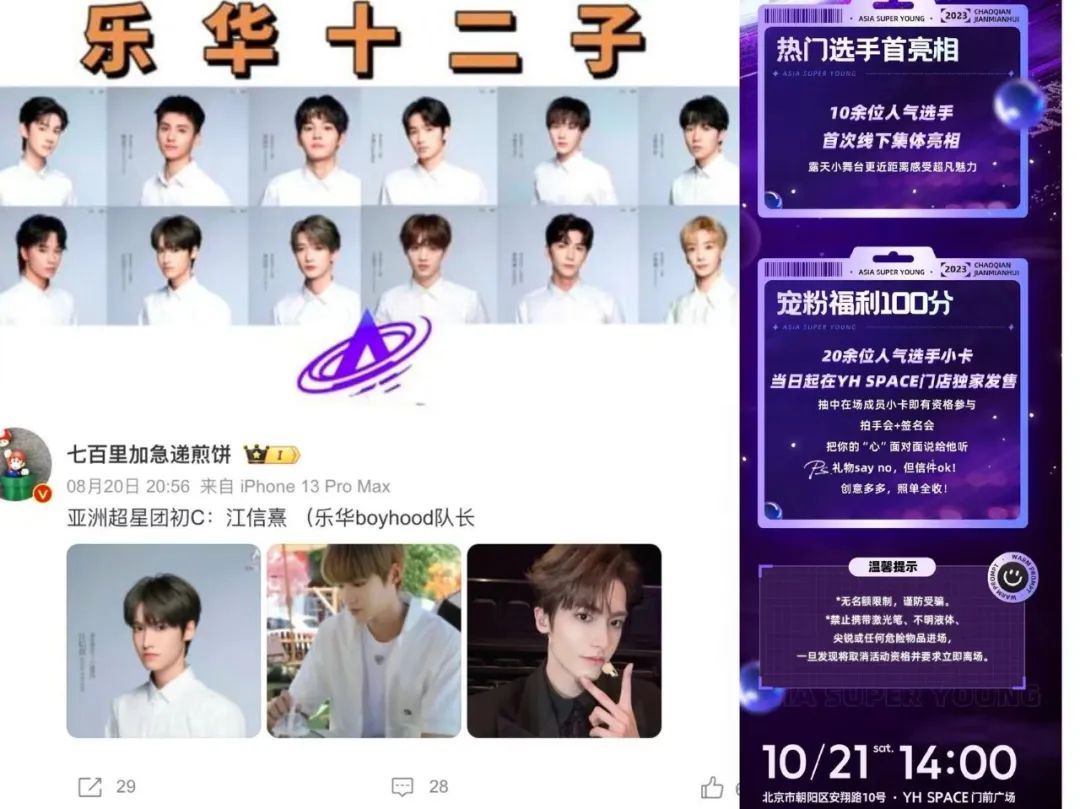 不仅如此,乐华艺人朱正廷、程潇还是《亚洲超星团》的导师。而且,据参与过录制的网友反馈,节目选出来的“初C”叫江信熹,正是乐华旗下男团boyhood的队长。更离谱的是,《亚洲超星团》播都没播,却要在北京举办人气选手的线下超前见面会,见面会的地点正是乐华新店YH SPACE。看来,曾志伟和灿星联手也是给他人做嫁衣,不知道还以为是乐华公司的内部选秀。