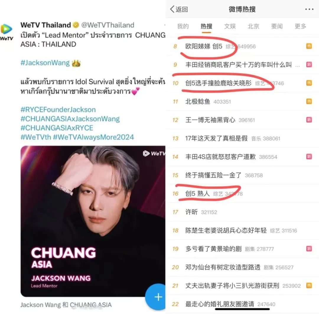 做这样一档大型节目想要回本,自然不太可能靠付费意识薄弱的东南亚观众,主要还得靠国内市场。所以,连中文logo都没有的《CHUANG ASIA》,却以“创5”的名义上了国内微博热搜,并在各大社交平台进行了一轮营销。