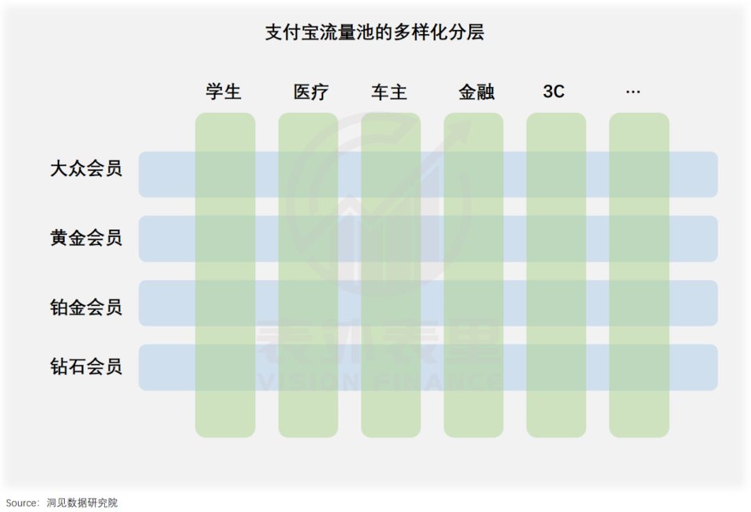 且在此基础上,支付宝还利用账户体系,将数量高达9亿的人群分为大众、黄金、铂金和钻石四个层级的会员,涵盖风险、收入、信用等多维度数据,“含金量”不言而喻。
