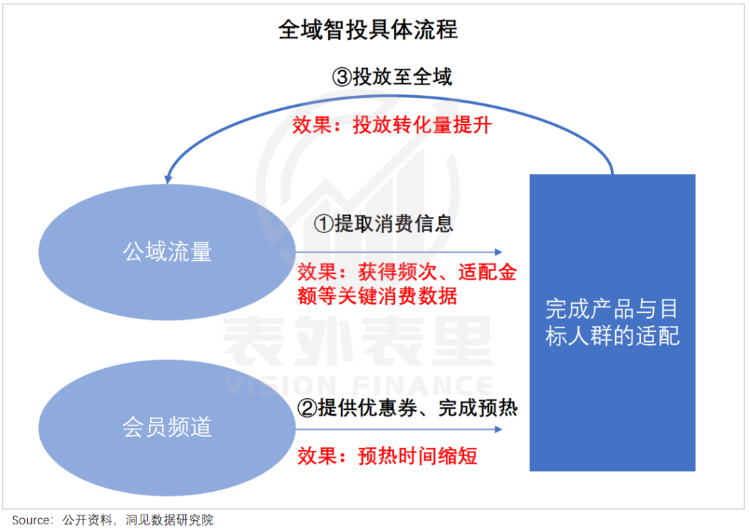 以“全域智投”为例,商品在公域获得关键消费信息后,进入会员频道“加热”,再投入到适配的公域之中。类似于海底捞新品上市前,会邀请全国会员试吃,再基于反馈选择性地推出腌笃鲜、海鲜金汤火锅等「区域上新」类爆品。