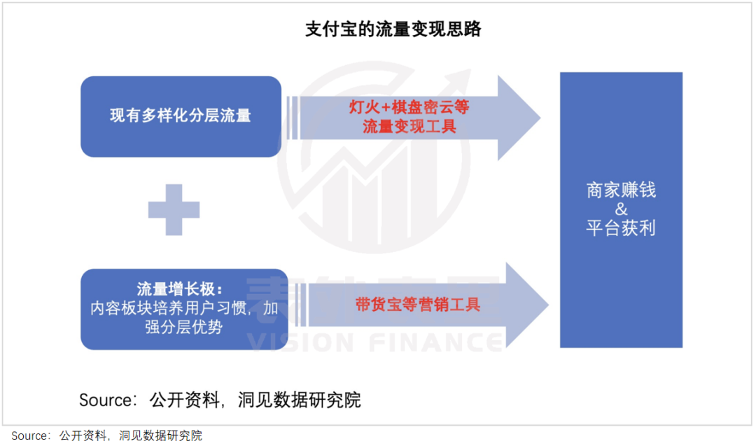 至此,支付宝的流量变现路径一目了然:基于平台线上线下多样化的分层流量,完善数字经营链路,提升商家与用户的连接效率,让商家赚到钱;同时,通过短视频、直播等内容吸引新流量,做大交易盘子,最终通过广告、抽佣、技术服务费等模式实现平台商业变现。