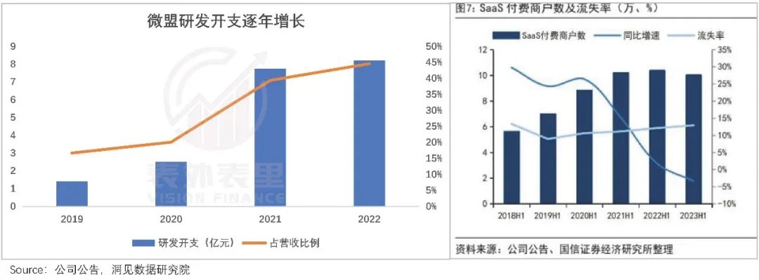 以微盟为例,为争取客户,大手笔研发卷个性化定制,但2023上半年商家流失率达到了12.9%,是美国SaaS企业客户年流失率中值(7%)的近两倍。