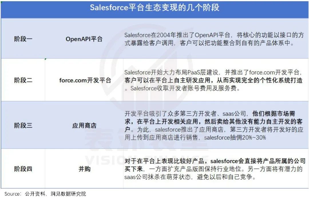 2004年,Salesforce开放了API接口,将核心的功能共享给服务商,让SaaS服务商的研发流程大大减少——好比做菜,过去要从种菜开始,现在直接拿Salesforce切好的食材,炒成客户想吃的菜即可。