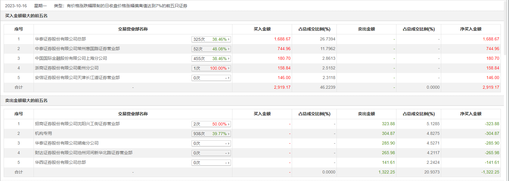 10月16日,茶花股份今日涨停,全天换手率达2.82%,振幅达11.78%。龙虎榜数据显示,营业部席位合计净买入1596.92万元。其中,机构合计净卖出304.87万元。此外,华泰证券总部、中泰证券常州惠国路证券营业部分别买入1688.67万元、744.96万元;招商证券沈阳兴工街证券营业部、华泰证券湖南分公司分别卖出323.88万元、285.9万元。