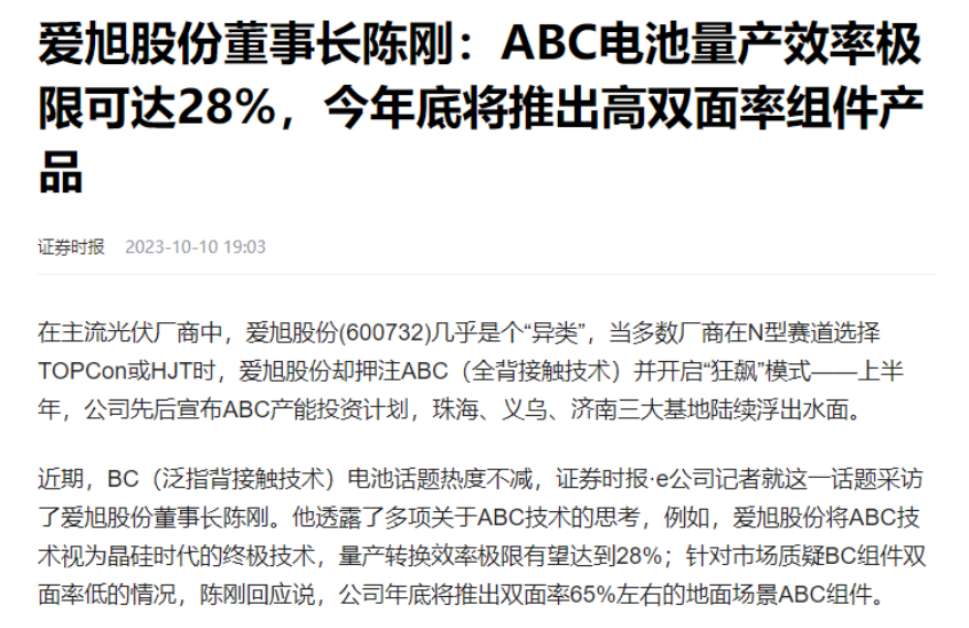 爱旭公开表示年底将推出双面率65%左右的ABC组件 来源:证券时报