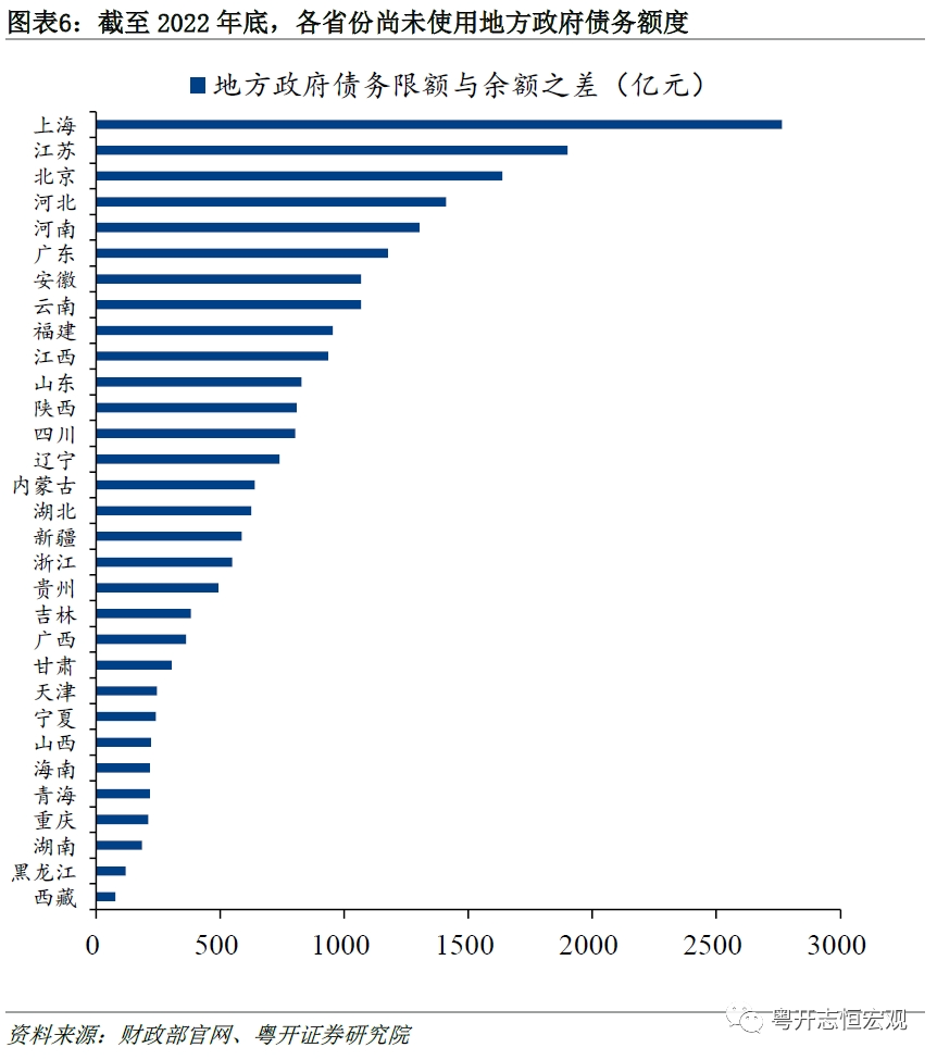 分省份来看,“限额-余额”空间分布不均衡,集中在上海、江苏、北京等债务压力较小的省份,短期内可通过回收再分配政策向债务负担较重地区倾斜。从2022年底各省份债务限额与余额的差额来看,上海、江苏、北京结存限额较大,分别为2765.5亿元、1900.1亿元以及1637.1亿元。西藏、黑龙江、湖南、重庆和青海等省份发行再融资债置换隐债的空间较小。