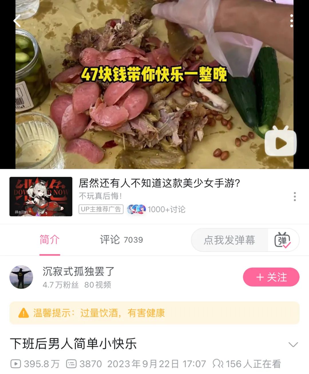 不过,如果要问于文亮的火爆是否代表着新的短视频内容创作风口,答案或许是否定的。无论是哪类平台,“普通叙事”都有走红的机会,B站一则名为《下班后男人简单小快乐》的视频便是如此,内容同样没有太多技巧,简单记录了下班路上打酒买肉,到家后看着视频一人小酌的普通生活,这则视频的播放量高达400万。
