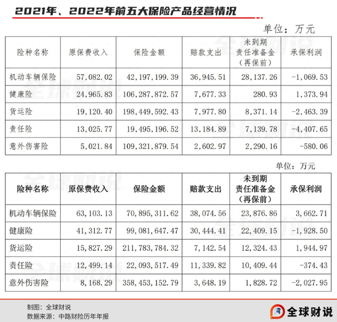 2021年全年,健康险也升为中路财险原保险保费收入排名第二的险种,也是前五大险种中唯一达到正承保利润的,当年达到了1373.94万元。