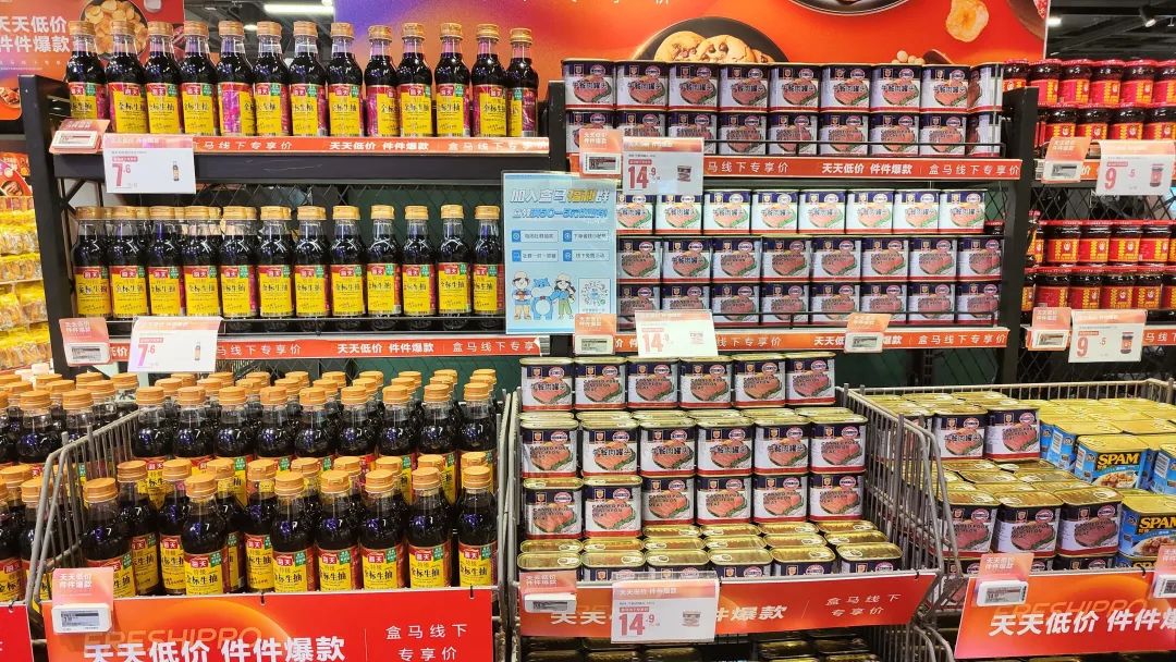 盒马会在显眼的地方,堆放单一的热门商品。这一天,在调料区货架外,集中摆放的商品,从左到右依次是海天特级金标生抽、梅林午餐肉罐头、老干妈。