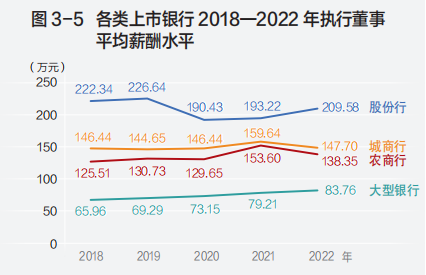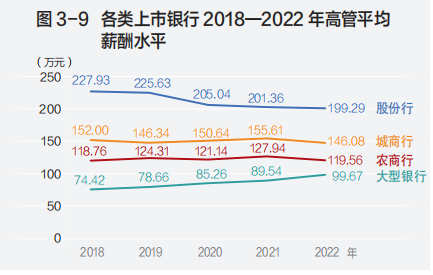 高管方面,2018—2022 年,各类上市银行高管平均薪酬的高低次序基本保持不变,即股份行最高,城商行和农商行依次占据第二和第三位,大型银行最低。
