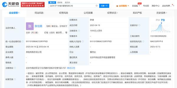 北京羊了个羊餐饮管理有限公司成立于2023年4月,法定代表人为张佳宾,注册资本1000万人民币,经营范围含餐饮管理、企业管理咨询、企业管理、普通货物仓储服务、粮油仓储服务、新鲜水果零售、食品销售等。(天眼查)