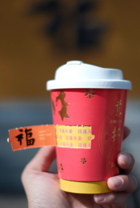 2023年的春节,慈杯咖啡就出了一款限定版本的杯子,加入了类似刮彩票环节,只要揭开杯套上设置的拉环,就能收到寺庙的祝福语,从一夜暴富,到日进斗金,每一个祝福语都戳中年轻人的心。