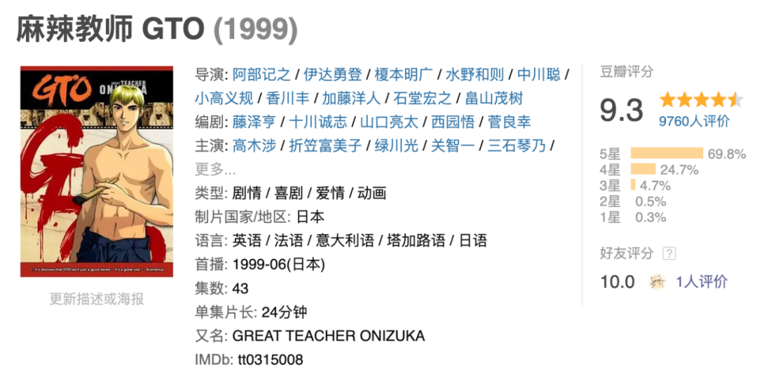 1999年,《麻辣教师GTO》动画版上线,这部动画目前在豆瓣上的评分为9.3分,还原了不少漫画中的名场面。