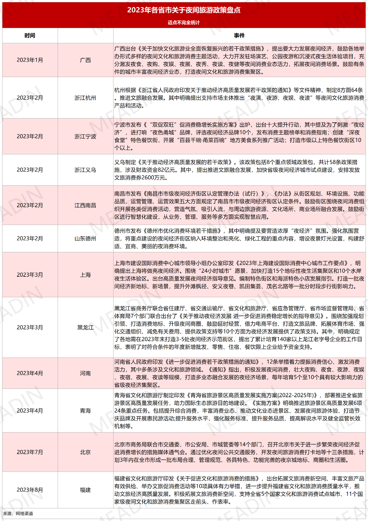 实际上,夜游经济的蓬勃并非偶然,而是政策端、需求端和供给端共同发力的产物。在政策端,最早支持夜游的政策可以追溯到2004年青岛出台的加快发展市区夜间经济的实施意见,在随后的十年里,杭州市、河北省、辽宁省先后出台政策推进夜经济发展。迈点盘点发现,今年以来基本上各省市所有涉及推进区域文旅景区高质量发展的政策文件都会有关于夜间旅游的规划。