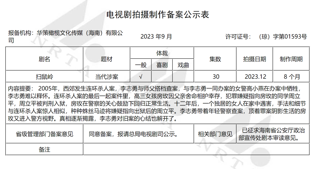 《扫鼠岭》由华策橄榄文化传媒(海南)有限公司备案,腾讯视频和华策影视出品,有望在今年年内开机。
