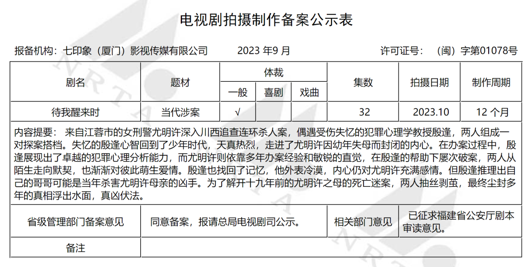 《待我醒来时》由七印象(厦门)影视传媒有限公司备案,改编自丁墨小说《待我有罪时》,腾讯影视和大音曦生出品。