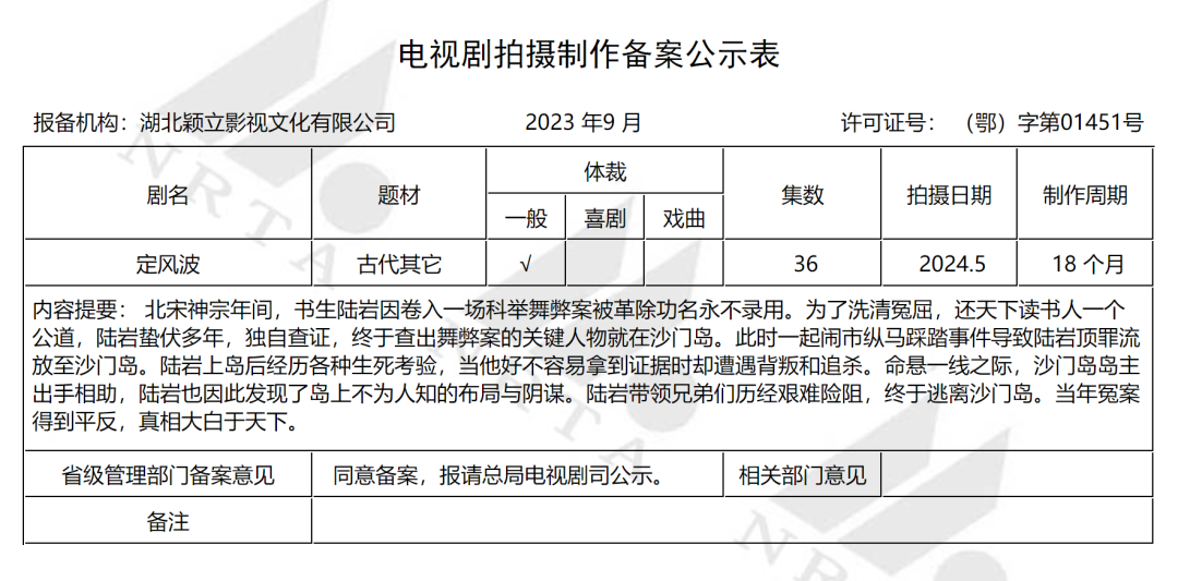 《定风波》由湖北颖立影视文化有限公司备案,本剧出现在了2024优酷片单中,由颖立影视与战友文化出品。