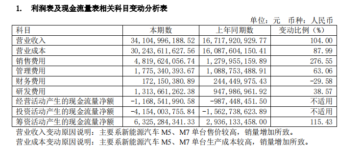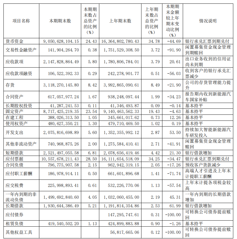 与此同时,赛力斯(601127)的短期借款、一年内到期的非流动负债及长期负债,同比大幅增加,达到了25.21亿元、14.99亿元、19.30亿元,分别较上年同期增长了21.30%、45.31%、61.99%。
