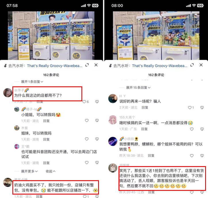 但在抖音零食很忙的官方账号中,有不少消费者在评论区中称直播间内购买的商品出现门店无法使用、门店不支持买1送1核销等问题。这在影响用户体验的同时,也让本次活动的最终效果大打折扣。