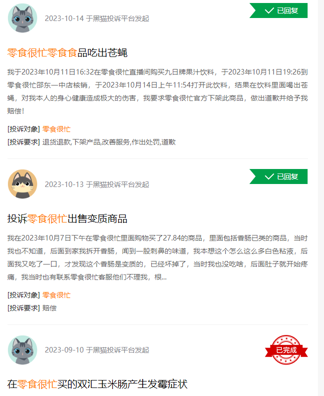 二是“零食很忙们”的这种便宜,能否真正做到食品安全,其品质是否会受到影响?以零食很忙为例,截至10月14日,零食很忙共涉及149起投诉,其中多起投诉主要包括吃出异物,食物不新鲜、发霉变质等。
