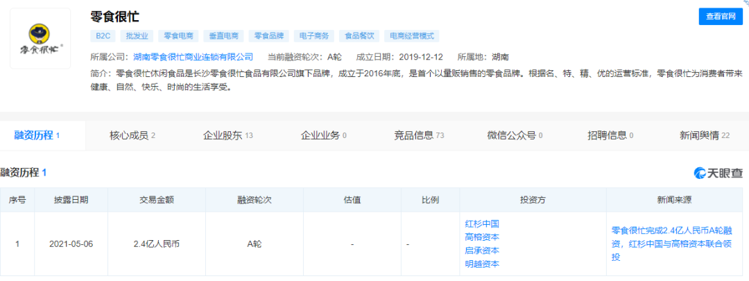 公开信息显示,成立于2019年的零食很忙于2021年5月,获得由红杉中国、高榕资本、启承资本、明越资本共同投资的2.4亿元A轮融资。但此后两年多的时间内,零食很忙的融资基本处于停滞状态。