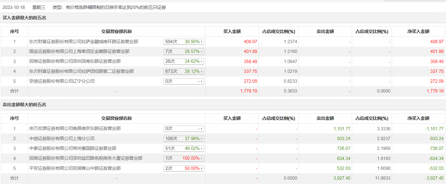 迎丰股份10月18日涨8.8%,全天换手率达43.39%,振幅达8.38%。龙虎榜数据显示,营业部席位合计净卖出2148.26万元。其中,东方财富证券拉萨金融城南环路证券营业部、国金证券上海奉贤区金碧路证券营业部分别买入408.97万元、401.89万元;申万宏源证券有限公司南昌南京东路证券营业部、中信证券上海分公司分别卖出1101.77万元、933.24万元。