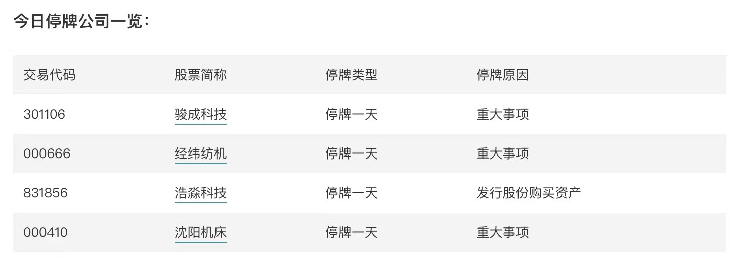骏成科技、经纬纺机、浩淼科技等4股今日停牌