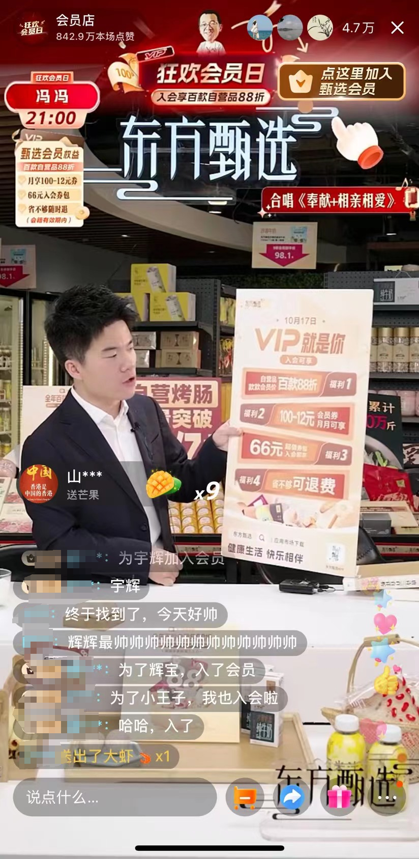 但众所周知,如果按商品原价来对标,所有的会员模式都是省钱的。淘宝的“88VIP”里随便单拎一个网易云或优酷的年费会员,其原价就已经不止88元了,所以单纯比较是否比原来更划算是没有意义的。消费者会选择在东方甄选APP进行会员消费,本质上一定有粉丝滤镜加成的作用。