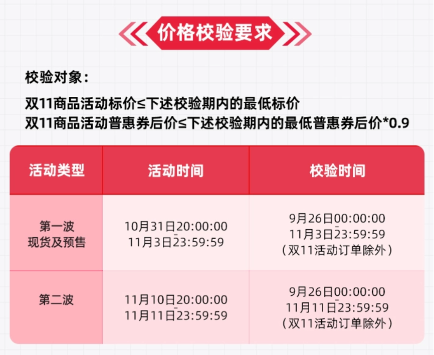 与此同时,继今年618推出首个淘宝好价节之后,天猫联合淘宝在双11主题活动之外组织“双11天天低价”分支活动,提供专属资源扶持,为低价商品带来展示机会,从而吸引商家参与。参与该活动的商品需要在特定时间段内,“累计达7天及以上商品价格力星级为四星/五星且商品竞争力任务为‘达标’”,即同款低价和全网低价商品。