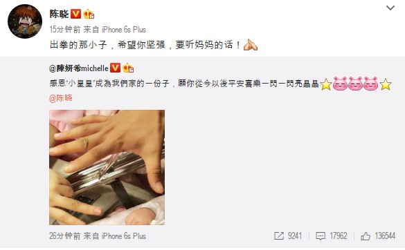 12月20日下午,陈妍希和陈晓共同更新微博分享喜讯,儿子取名“小星星”。