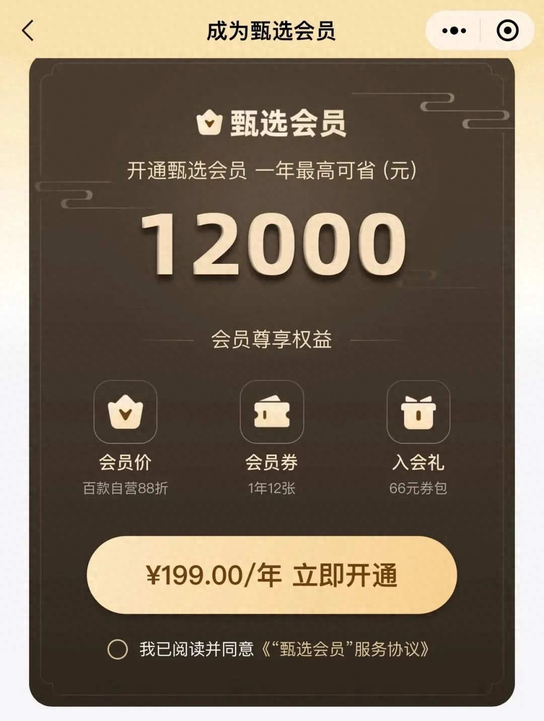 10月17日,东方甄选正式上线了付费会员制度,会员定价为199元/年,权益则包括了东方甄选百款自营品8.8折、一年12张会员券、66元券包入会礼等。