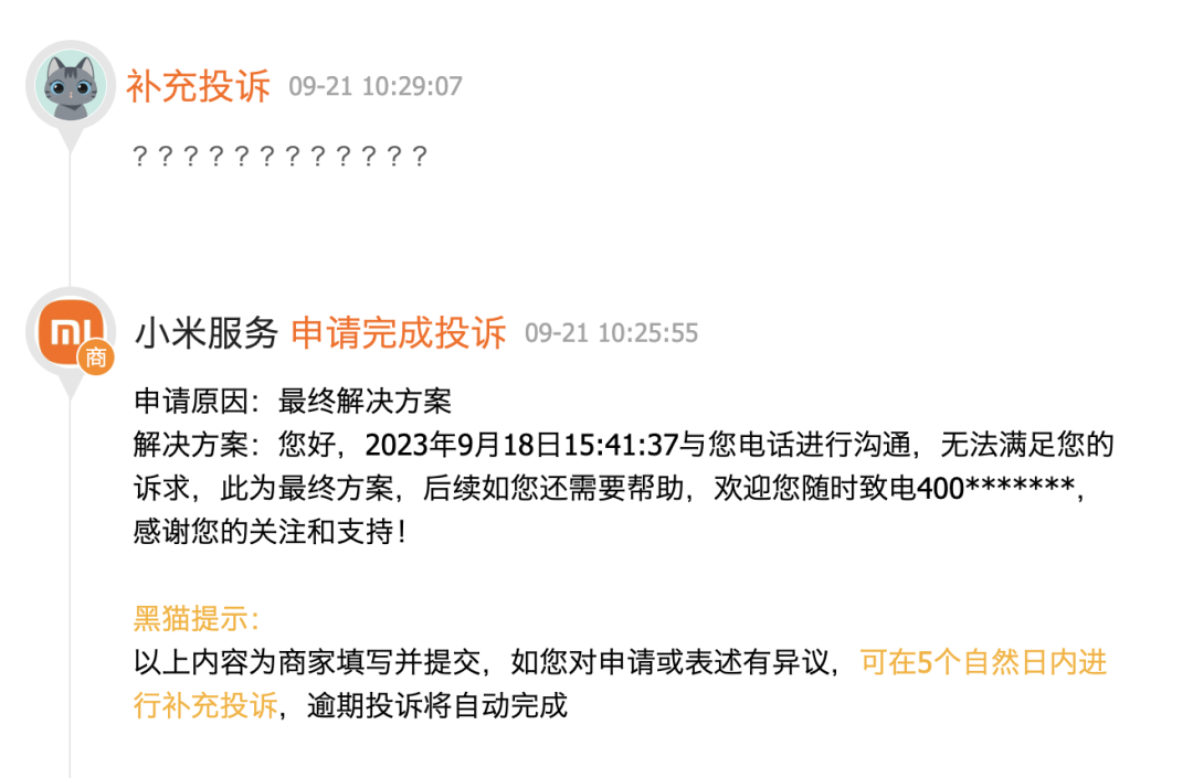 暂且不论小米的产品质量是否存在问题,在这一起投诉案例,小米方面给出的最终解决方案回复是:“您好,2023年9月18日15:41:37与您电话进行沟通,无法满足您的诉求,此为最终方案,后续如您还需要帮助,欢迎您随时致电400*******,感谢您的关注和支持!”面对“最终解决方案”,只剩下消费者原地一脸问号。