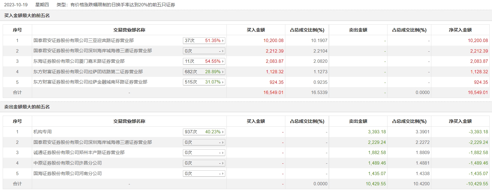 其中,机构合计净卖出3393.18万元。此外,国泰君安证券三亚迎宾路证券营业部、国泰君安证券深圳海岸城海德三道证券营业部分别买入1.02亿元、2212.39万元;国泰君安证券深圳海岸城海德三道证券营业部、诚通证券郑州丰产路证券营业部分别卖出2229.24万元、1882.58万元。