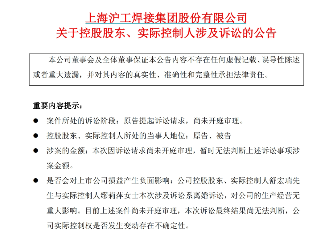 此前其他上市公司实控人的离婚,大多采取的是友好协商的方式,属于“和平分手”。而上海沪工则是因为得知舒宏瑞夫妇涉及离婚诉讼,才将此事公告了出来。