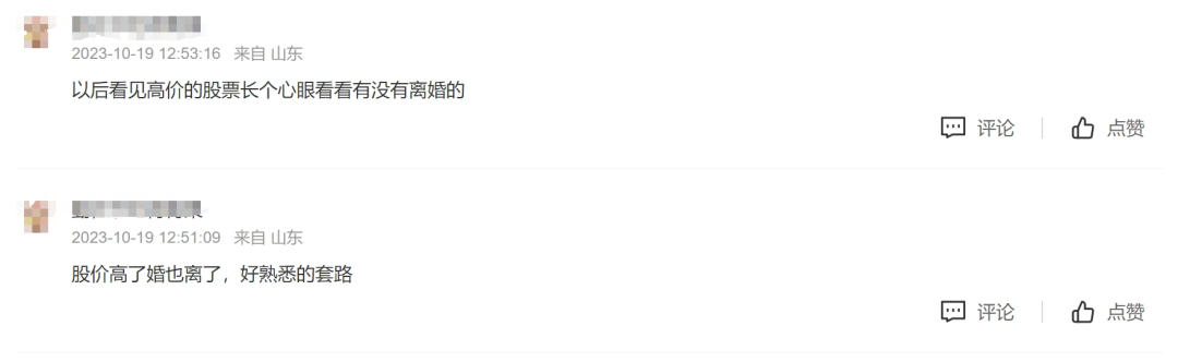 “以后看见高价的股票长个心眼看看有没有离婚的”“股价高了婚也离了,好熟悉的套路”,有网友评价道。