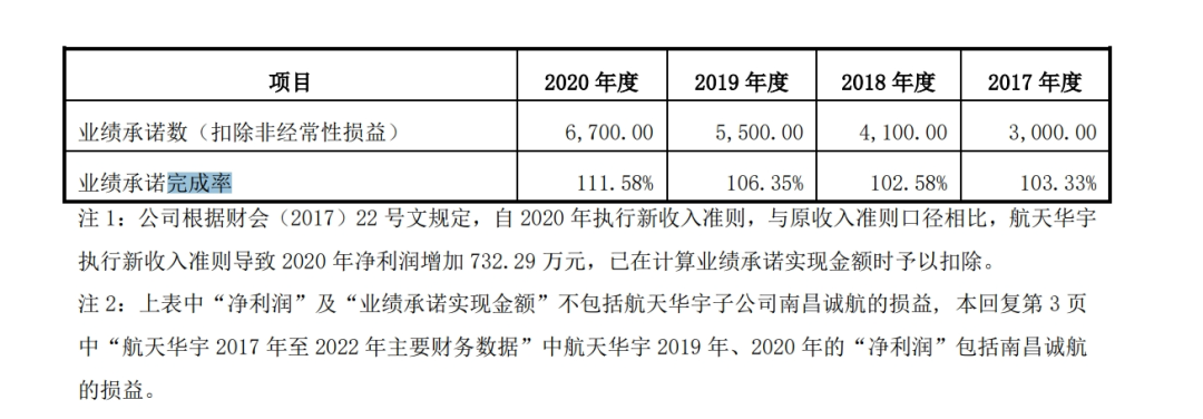 收购同时,航天华宇承诺2017年-2020年公司扣非净利润分别不低于3000万元、4100万元、5500万元、6700万元。而航天华宇也确实兑现了承诺,而且每年都是“擦边”完成,完成率分别为103.33%、102.58%、106.35%、111.58%。