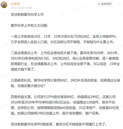 “业绩高点上市,上市后业绩肯定大幅下滑。福华化学核心业务是草甘膦,是一家典型的周期行业,在业绩最高点上市,上市后肯定业绩下滑。可以肯定其2023年业绩就大幅下滑了。”自媒体“初善投资”表示。
