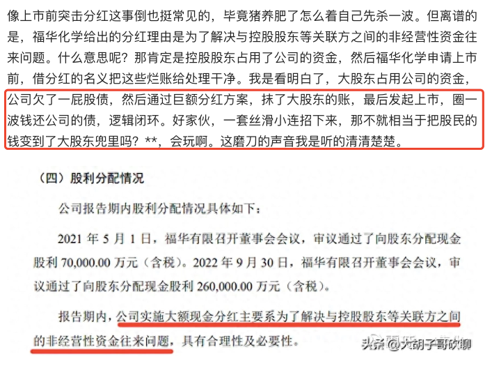 “我是看明白了,大股东占用公司的资金,公司欠了一屁股债,然后通过巨额分红方案,抹了大股东的账,最后发起上市,圈一波钱还公司的债,逻辑闭环。”一股民表示。