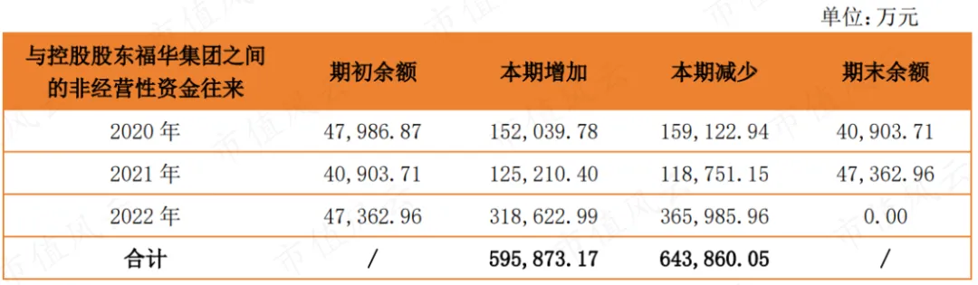 据“市值风云“统计,2020年-2022年,福华化学与控股股东福华集团之间,非经营性资金往来发生额合计高达59.59亿元,其中2022年高达31.86亿元。