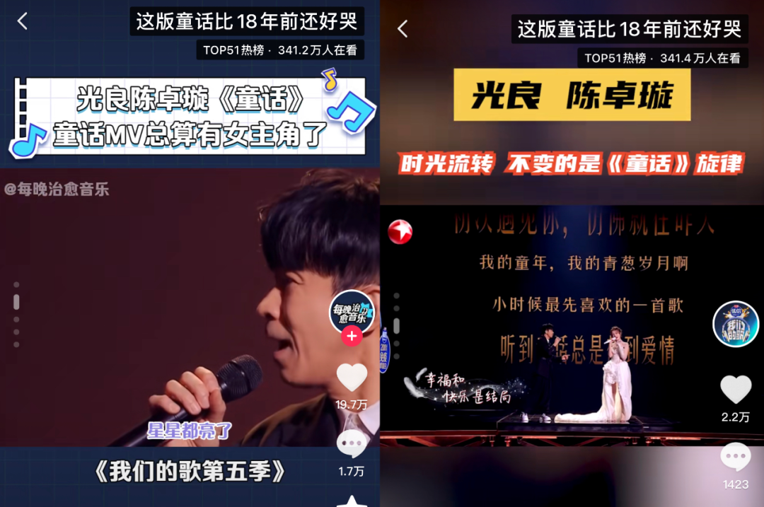 启示之二是,音综要赋予老歌“当代理解”。具体来说,《童话》找来新生代的陈卓璇与光良合唱是很讨巧的做法。无论陈卓璇唱得是好是坏,用一个新鲜嗓音唱出对这首歌当下的理解是必要的,它能催生的话题也是短视频爱讨论的。