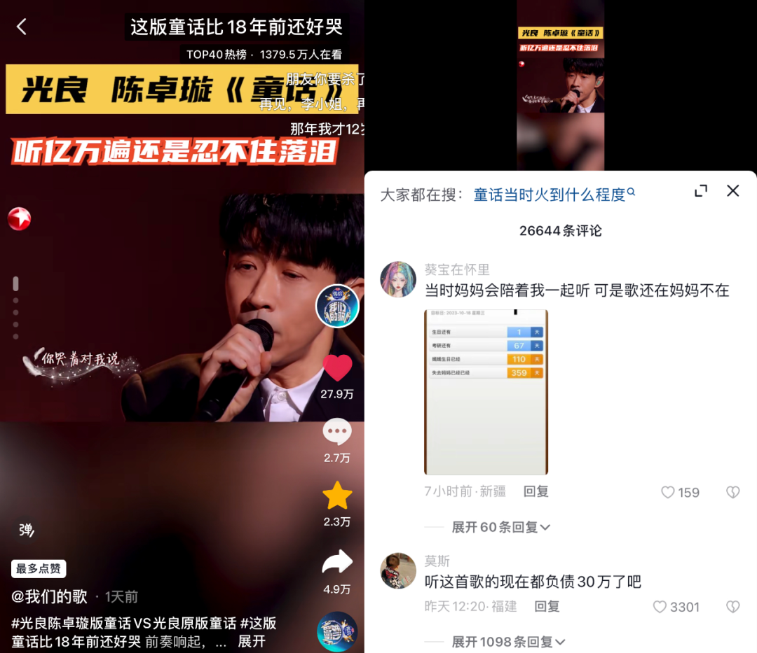 这次音综版《童话》上抖音热榜的词条叫 #这版童话比18年前还好哭# ,这份“好哭”,除了因为歌曲本身内容具备跨越时间的经典性,再加诸其上的一层,是已然成长的听众在18年后以全新心境重听这首歌的情绪复杂性。